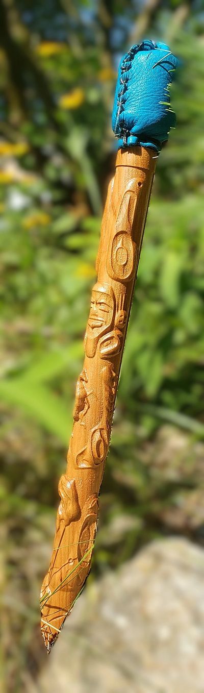 The Totem Drumstick is specifically intended to be a small tribal totem pole that brings the sacred aspects of the traditional Pacific Northwest Coastal Totem Poles to all people that hold such traditions and beliefs with importance and reverence. These totem drumsticks are also used as Talking Circle Sticks, Medicine Staffs, Talisman or to assist people in being grounded during their meditation.
